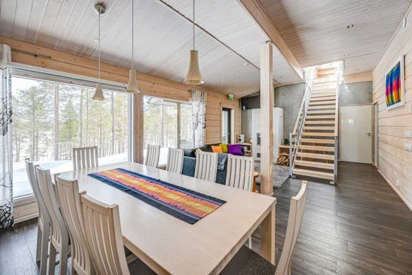 Laadukkaan ja korkeatasoisen Auroran viisi makuuhuonetta majoittavat kymmenen henkilöä, ja suuressa tuvassa voit rentoutua takkatulen äärellä perheen tai ystävien kesken. Aurora soveltuu mainiosti myös pienen ryhmän illanviettopaikaksi. Hirsihuvilan suuret ikkunat avautuvat koskemattomaan luontoon ja yläkerran lasinen näköalahuone tarjoaa upean mahdollisuuden nauttia revontulten loimusta, kirkkaasta tähtitaivasta tai keskikesän yöttömästä yöstä mukavasti sohvalla istuen.
