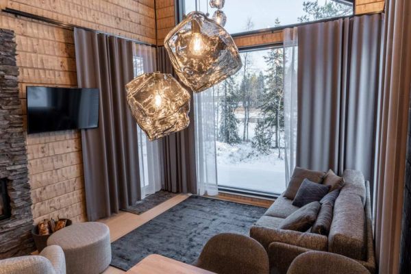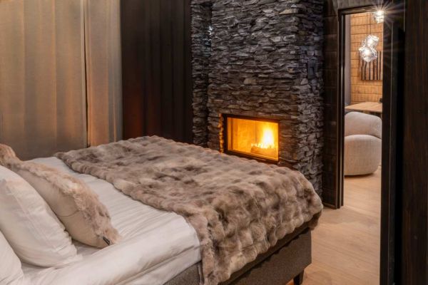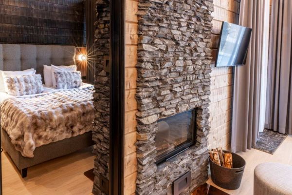 Experience the ultimate blend of comfort and elegance in our exclusive one-bedroom lodges, ideal for 2+2 guests. Each lodge features a stylish living room and bedroom with a cozy fireplace, a fully equipped kitchenette, a private sauna, and a modern bathroom. Step out onto your private terrace to unwind in your very own outdoor hot tub — all surrounded by the serene beauty of nature. Perfect for a romantic getaway or a peaceful retreat with premium comforts.
