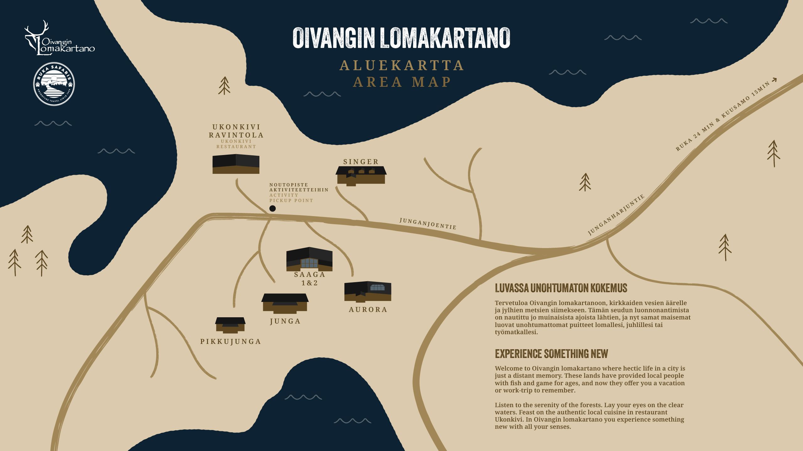 Oivangin Lomakartano resort is located a 15-minute drive from Ruka and Kuusamo. The area features six different villas and offers accommodation for a total of 66 people. The impressive kelo and log villas stand in a naturally beautiful ridge landscape surrounded by lakes. The area offers a true dream destination for relaxation, recreation, inspiring meetings, and vacations.