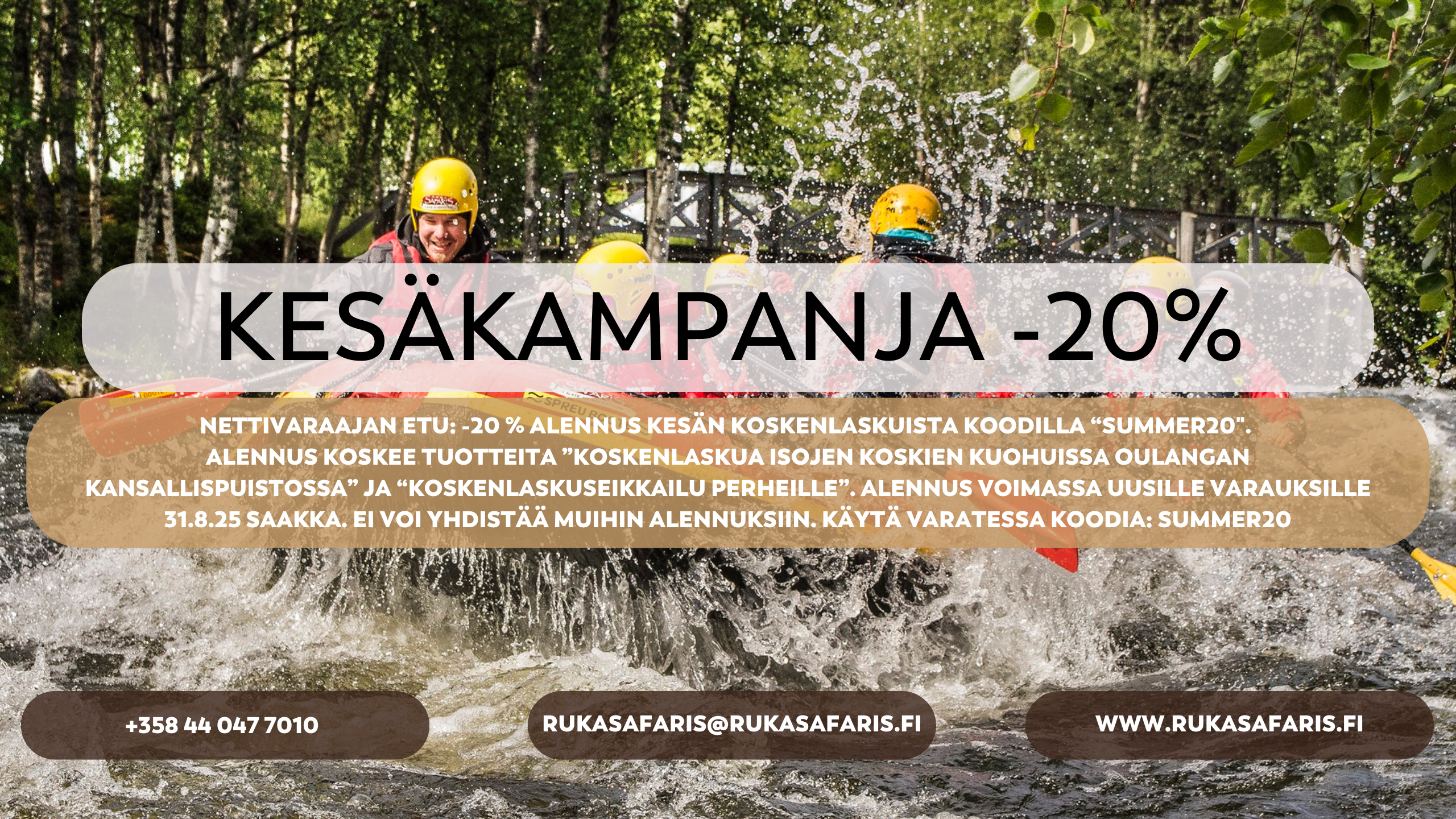 Koskenlaskulähdöt ma-la, useita lähtöjä päivässä läpi koko kesän. Koskenlaskujemme lähtöpaikka on Rukalla sijaitsevassa safarikeskuksessamme (Onkerniementie 12). Safarikeskuksellamme runsaasti maksutonta pysäköintitilaa.